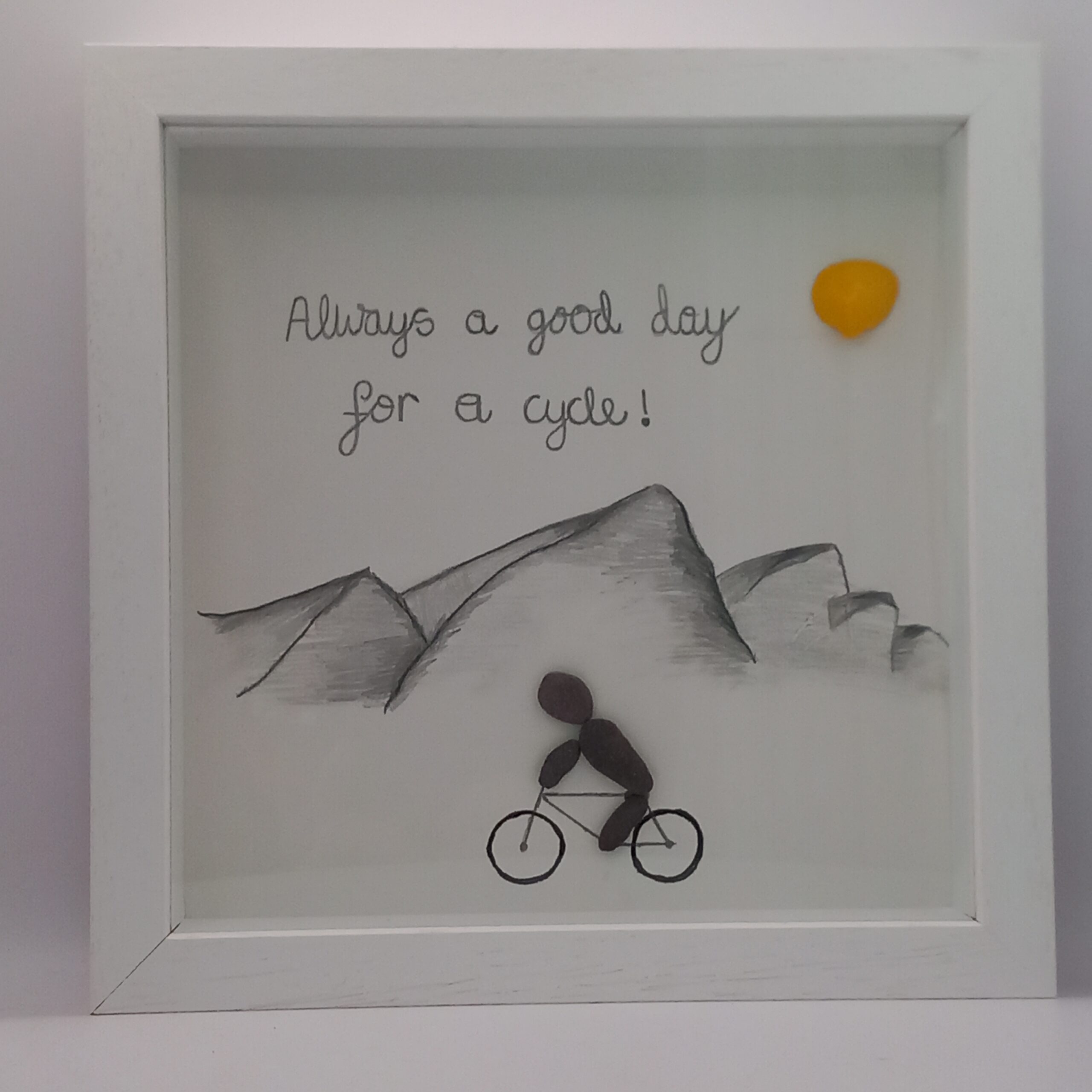 This Craft box frame is made with a mixture of locally sourced sea stones, Shells and text. This mixture makes this picture frame an ideal gift for a Cycling enthusiast. All these frames will free stand or hang from a wall with D ring on each frame. All products are handmade so as a result they are unique. This uniqueness makes it impossible for two products to be the same.