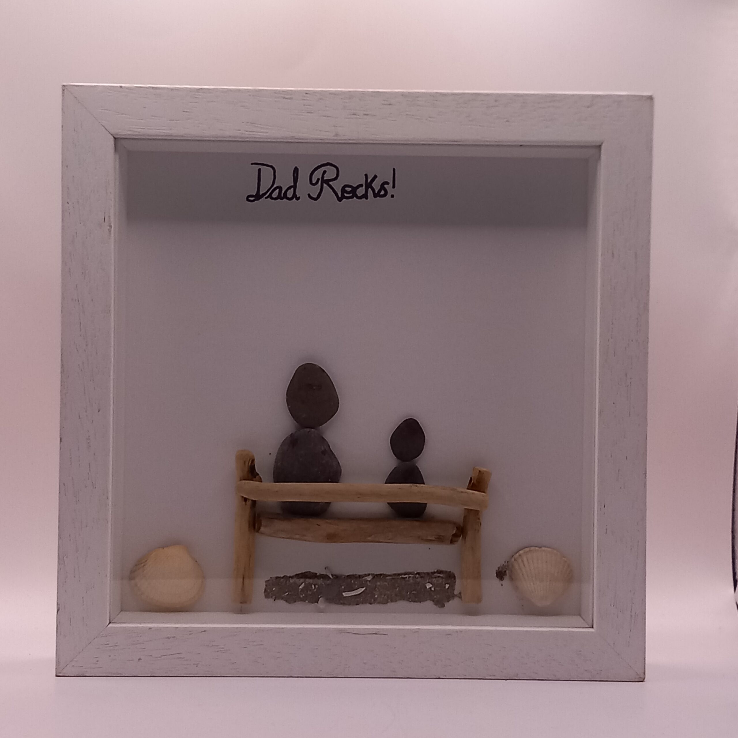 As a dad myself I had great fun making this Pebble art picture frame. Each pebble art picture is made with a mixture of locally sourced sea driftwood, seashells & Sea sand. This mixture makes this picture frame an ideal gift for that all important person. All these frames will free stand or hang from a wall with D ring on each frame. All products are handmade so as a result they are unique. This uniqueness makes it impossible for two products to be the same.