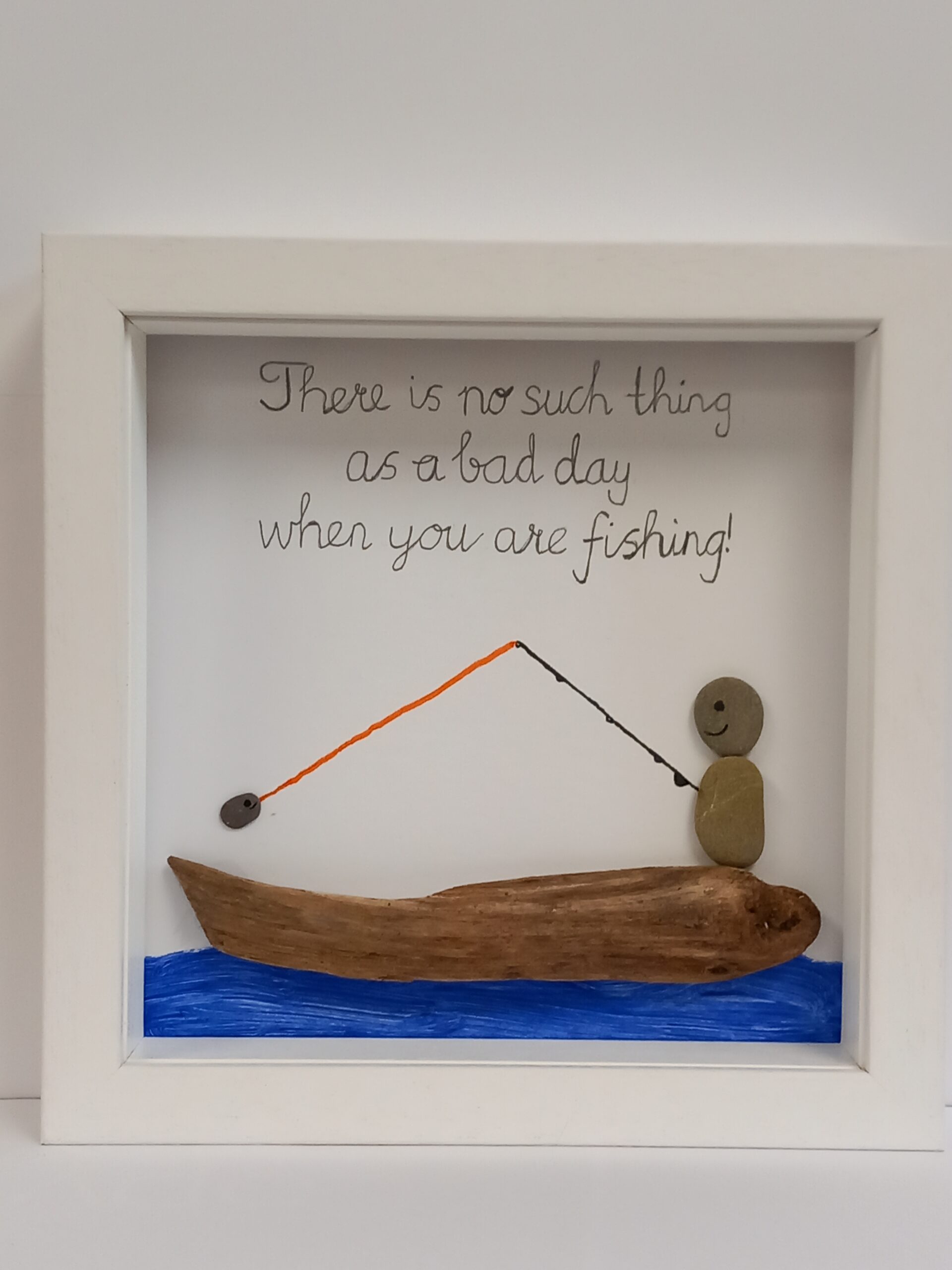 As a fishing enthusiast this pebble art fishing picture idea came naturally to me. Like any outdoor pursuit it involves a mixture of the that feel good outdoor factor mixed in with that day of fishing.   Picture frame is made with a mixture of locally sourced sea stones & driftwood  This mixture makes this picture frame an ideal gift particularly for fishing enthusiasts. All these frames will free stand or hang from a wall with D ring on each frame. All products are handmade so as a result they are unique. This uniqueness makes it impossible for two products to be the same.