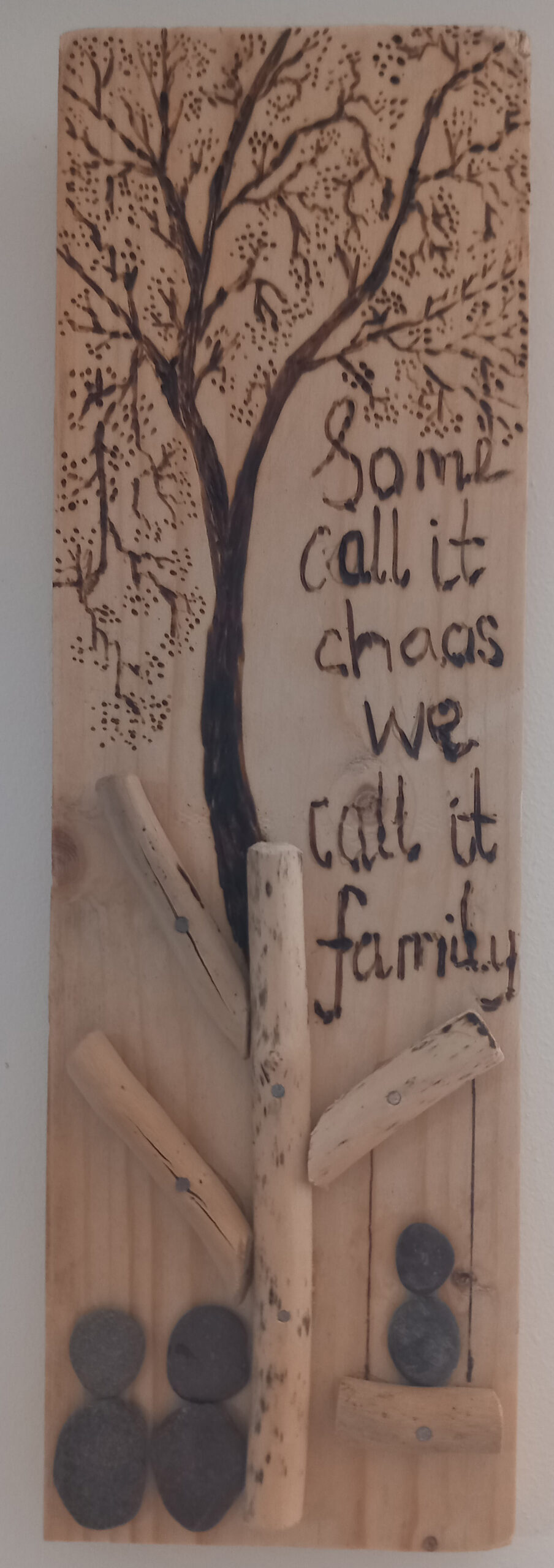 This wall art piece made with a mixture of locally sourced sea stones, & timber. This mixture and text burnt into wood create the perfect household wall art piece and gift. All these pieces hang from a wall with D ring on each piece. All products are handmade so as a result they are unique. This uniqueness makes it impossible for two products to be the same