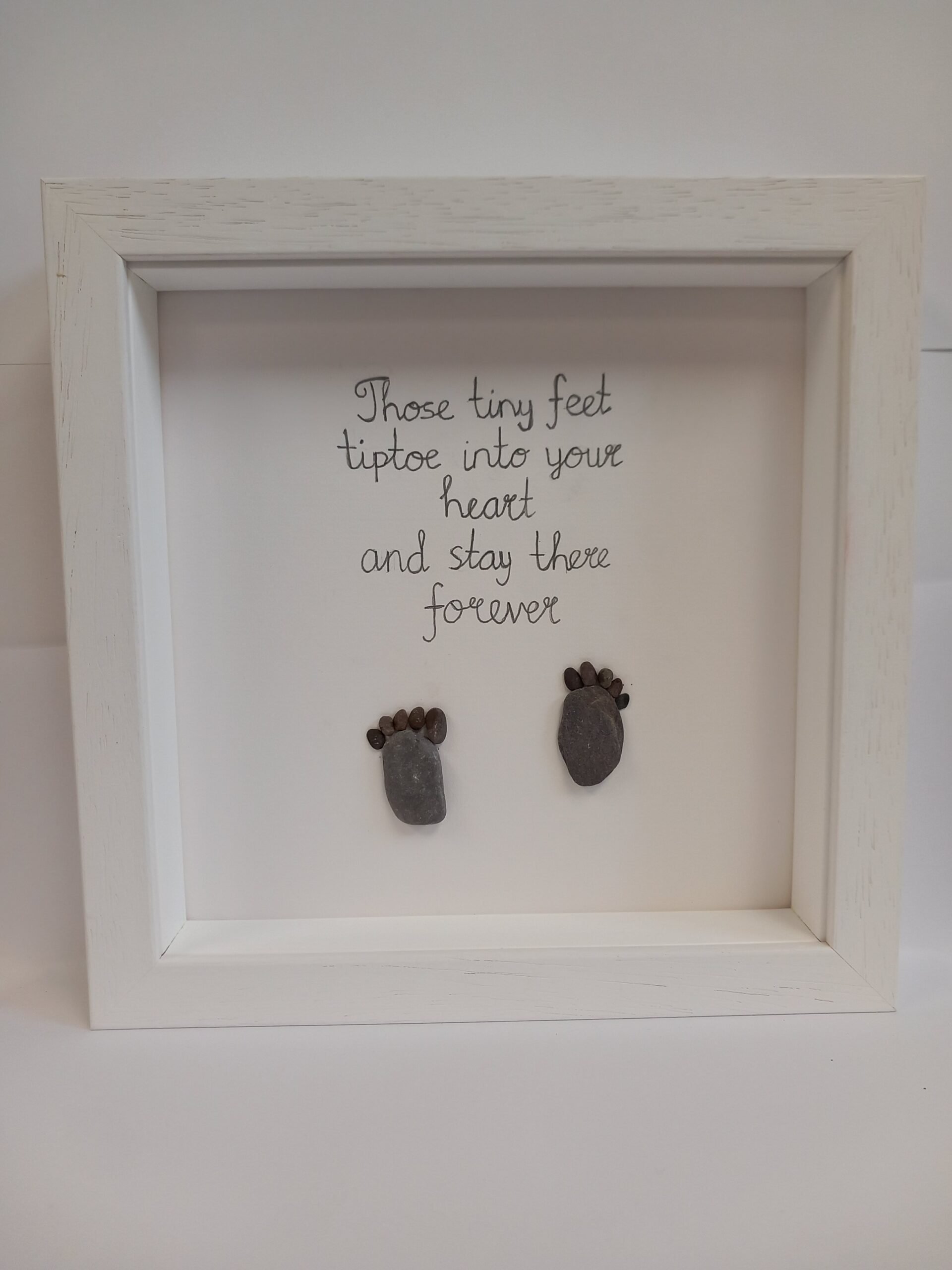 Craft box frame made with a mixture of locally sourced sea stones, driftwood & text. This mixture makes this picture frame an ideal gift for a new arrival. All these frames will free stand or hang from a wall with D ring on each frame. All products are handmade so as a result they are unique. This uniqueness makes it impossible for two products to be the same.