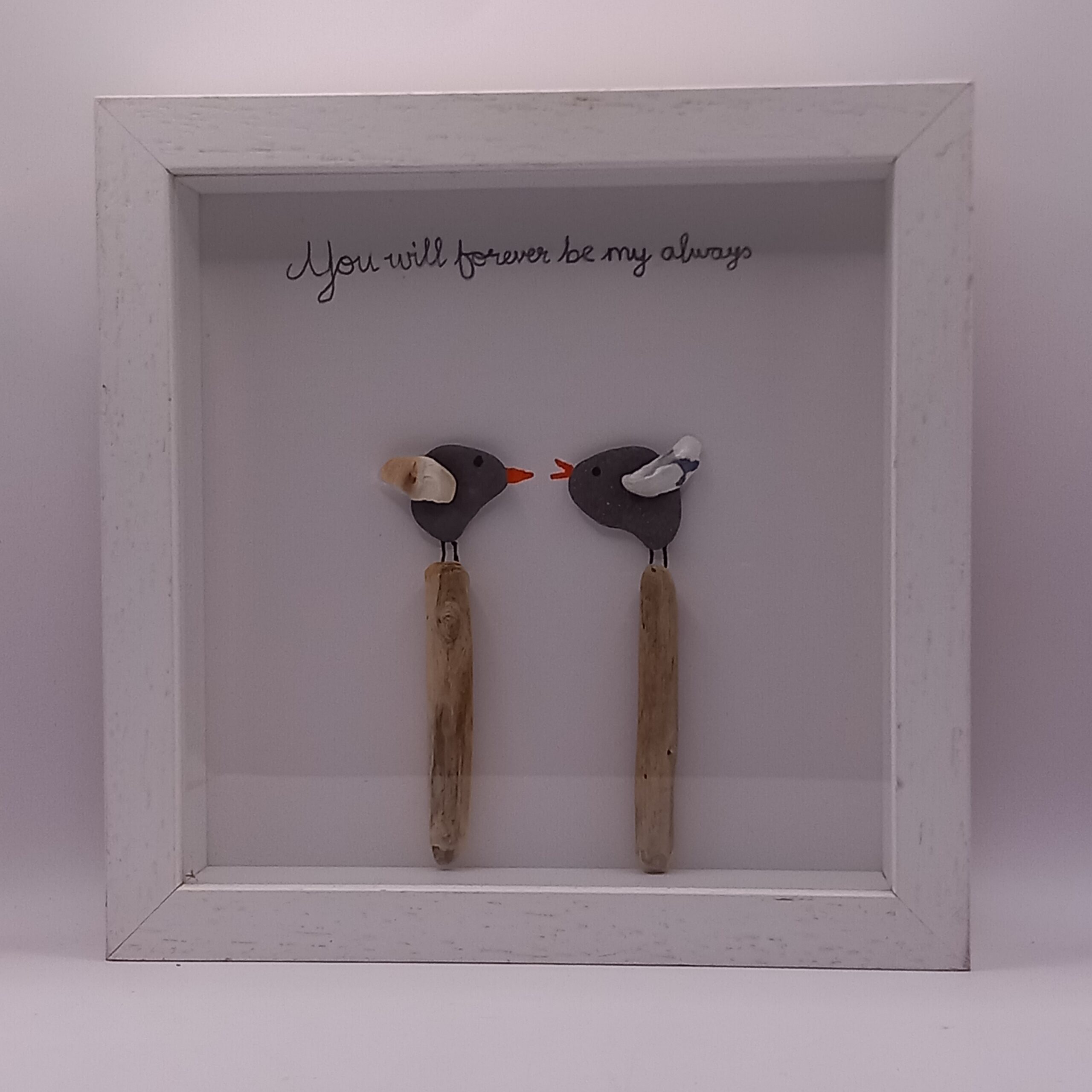 I  created this pebble art picture frame with that that gift for that all important person in mind. This Craft box frame is made with a mixture of locally sourced sea driftwood, Seashells, sea stones, inspiration & of course  text . This mixture makes this picture frame an ideal gift for that important person. All these frames will free stand or hang from a wall with D ring on each frame. All products are handmade so as a result they are unique. This uniqueness makes it impossible for two products to be the same.